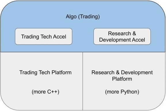Each of these two divisions has both Acceleration and Platform teams. The engineering group dedicated to working most directly with specific Algo teams is formally called “Acceleration” (e.g. Trading Acceleration and Research Acceleration), because their job is to accelerate our trading teams’ activities. Informally you will often hear this type of job referred to as “an embedded engineering” job. The idea is that the engineer is “embedded into” the trading team, often aligned with a particular trading strategy or specific sub-team of Algo Developers.